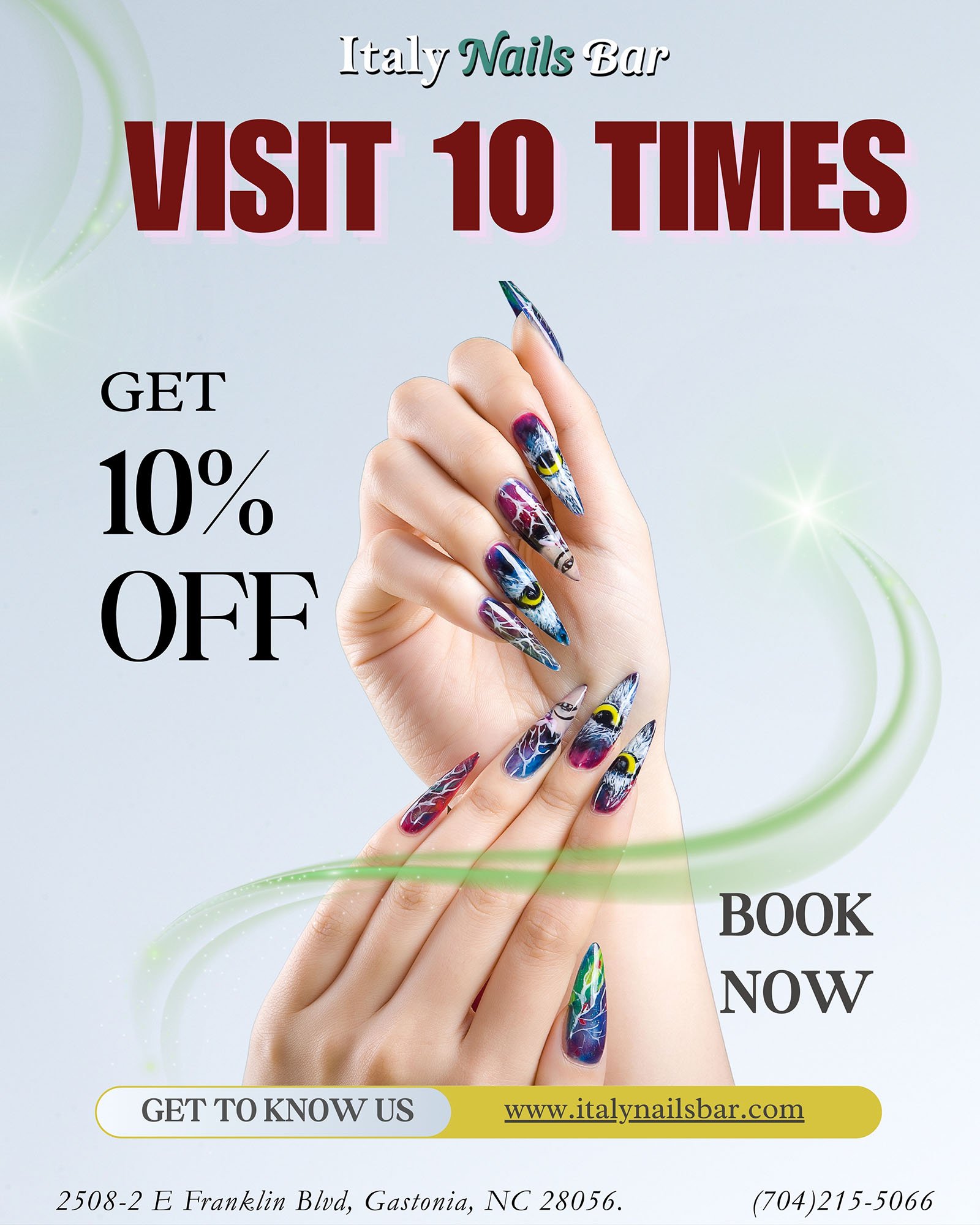 Welcome to Italy Nails Bar, where we pride ourselves on delivering top-quality nail and skin care services. Located at 2508-2 E Franklin Blvd, Gastonia, NC 28056 our dedicated team of skilled professionals is committed to providing exceptional service tailored to your individual needs. From manicures and pedicures to nail enhancements, we offer a wide range of services to ensure that every visit is a delightful experience. Call now (704) 215-5066